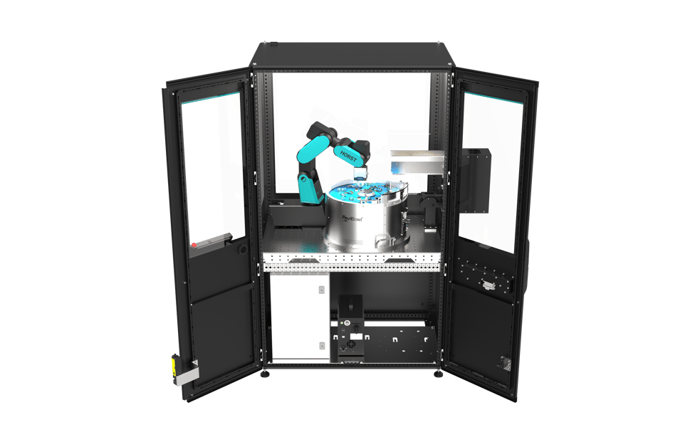 Das Solution Kit Part Separation mit 2D Grasping-Kit vereint den KI-gestützten Industrieroboter HORST600, das 2D Grasping-Kit von SCHUNK inklusive dem mechatronischen Kleinteilegreifer EGK sowie den Bauteilvereinzeler FlexiBowl und ermöglicht die visionbasierte Automatisierung von Vereinzelungsprozessen. Diese Prozesse können hochkomplex sein, insbesondere wenn es um die Lokalisierung verschiedenartiger Bauteile geht oder wechselnde Lichtverhältnisse vorliegen. Durch den Einsatz des 2D Grasping-Kits im Automatisierungsmodul von fruitcore robotics wird die Teilevereinzelung auch bei wechselnden Anforderungen vereinfacht. Das integrierte 2D Grasping-Kit umfasst ein Kamerasystem samt Objektiv, einen Industrie-PC, die SCHUNK KI-Software sowie ein Plugin zur einfachen Einbindung in die Robotersteuerung. Es lokalisiert verschiedenartige Bauteile und erkennt deren Lage und Orientierung, um sie bedarfsgerecht zu greifen und weiterzuverarbeiten. Wenn der Roboter beispielsweise Bauteile mitsamt transparenter Umverpackung (zum Beispiel Schrauben und Muttern in einem Kunststoffbeutel) greifen soll, gewährleistet die intelligente KI-Software von SCHUNK eine zuverlässige Erkennung der Bauteile während des Prozesses.